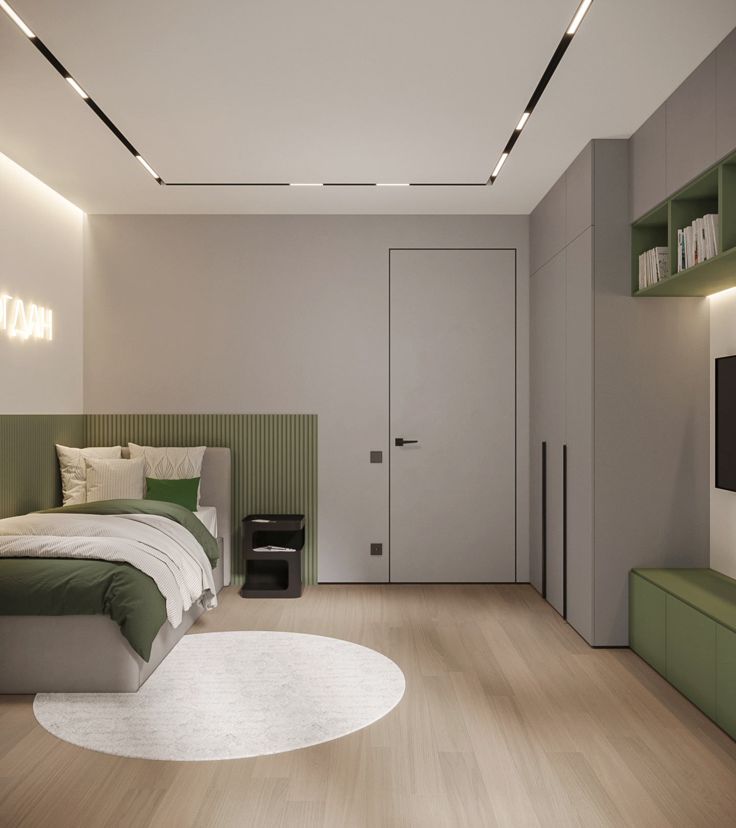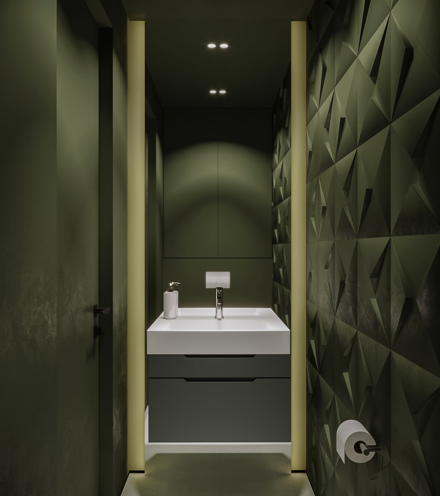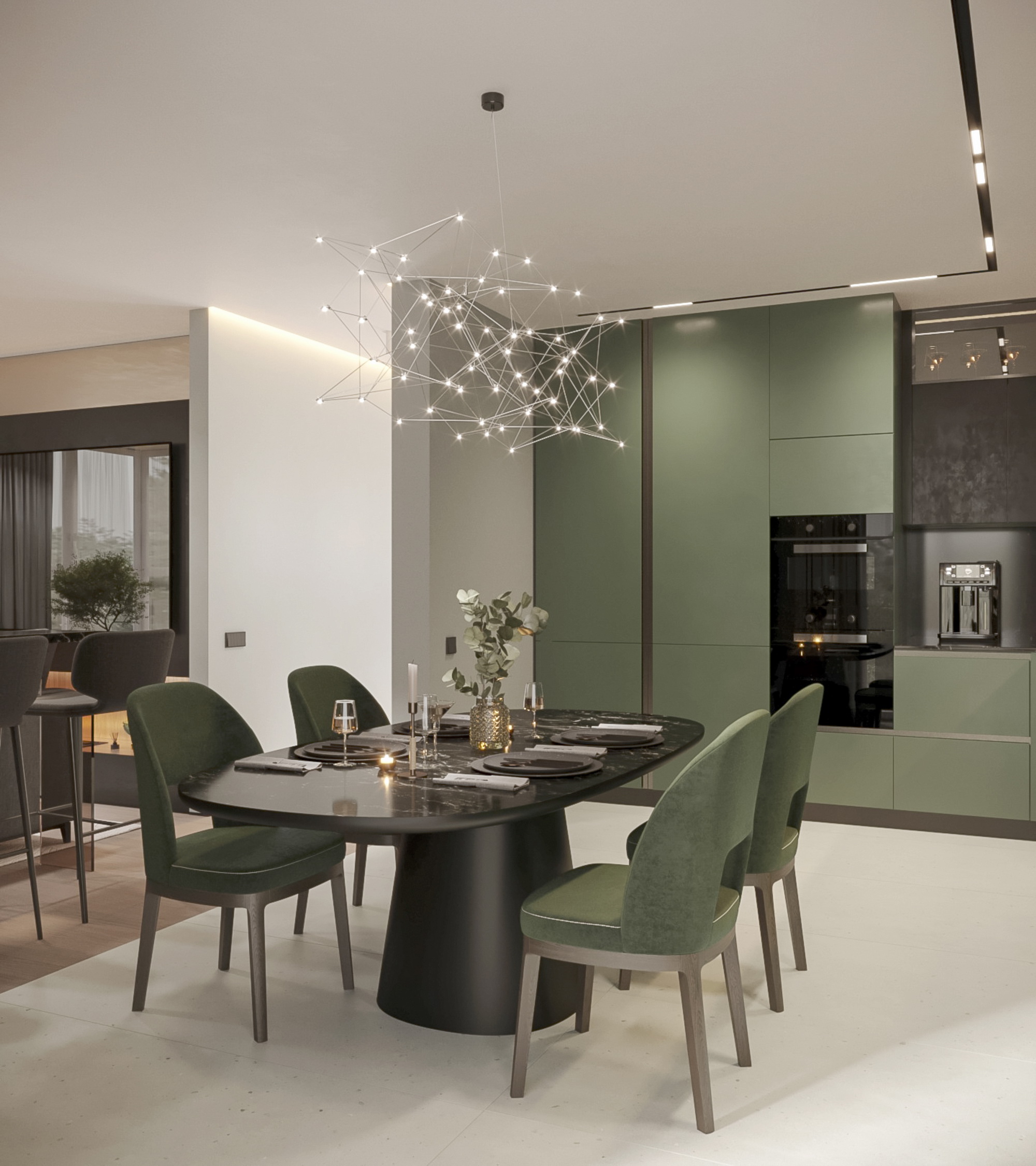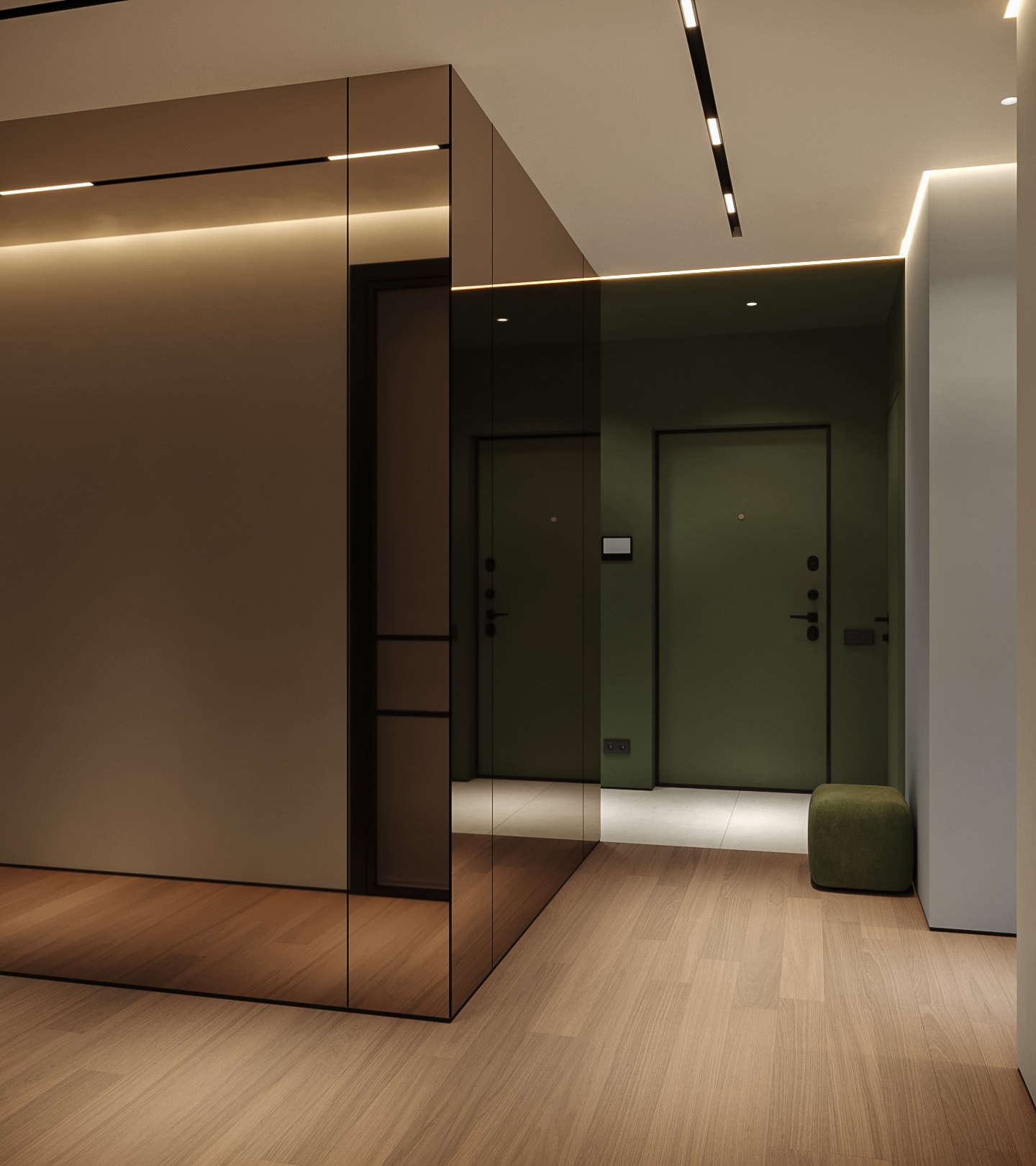 Пожеланием заказчика было создание интерьера преимущественно в глубоких зелёных тонах, в которых каждый член семьи будет чувствовать себя комфортно и спокойно.